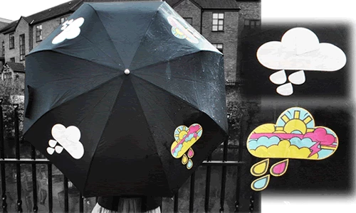 The Colour Changing Umbrella has four pictures of clouds made from colour changing materials. When these get wet they will change colour and when they dry turn grey again.