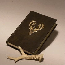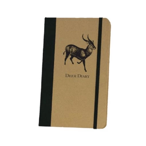 Deer Diary is a travel-sized journal with a plain kraft paper cover, a black cloth spine, elastic closure and satin bookmark.