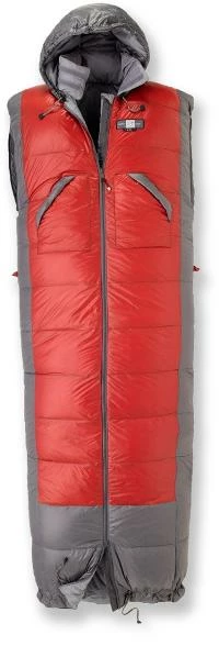 The Dreamwalker 450, a down-filled, wearable sleeping bag that can be unzipped and cinched up for easy wear as a poncho. Rated to 35 degrees Fahrenheit, it keeps you warm in the parka-like comfort of 450-fill goose down, one of the best insulators around. Zippered sides allow you to keep your arms free when you’re wearing the mummy hood while a zip-off bottom makes it possible to walk around camp.