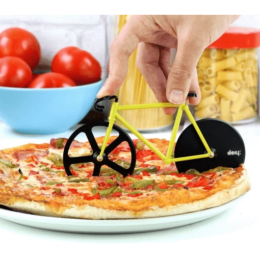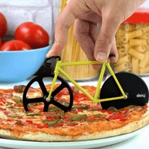 Don’t use a knife, just run your pizza over with your bike, straight down the middle. This mini bike, the Fixie Pizza Cutting Bike has sharp narrow tyres, ideal for pushing (don’t ride it) over your pizza and cutting it into unequal pieces to share with your friends.