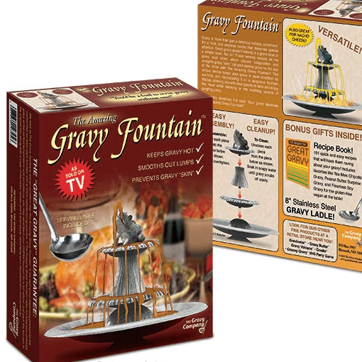 Probably what everyone has always ever wanted. If you have a Gravy Fountain then life must be pretty good, it won’t get much better. Gravy glistening as it travels down the fountain, just dip in your yorkshire pudding and you’ve reached heaven.